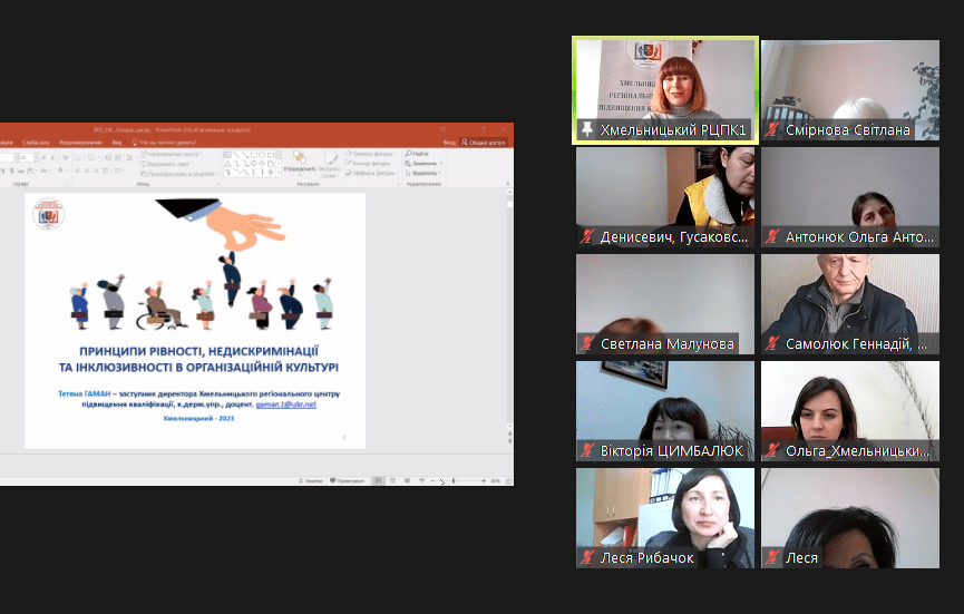 Продуктивна п’ятниця у Хмельницькому РЦПК – завершили дводенне дистанційне (в режимі реального часу) навчання за загальною короткостроковою програмою ««ФОРМУВАННЯ ОРГАНІЗАЦІЙНОЇ КУЛЬТУРИ ТА ВПРОВАДЖЕННЯ ЗМІН»»![]()