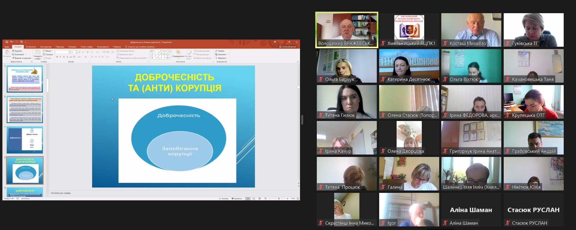 . Протягом навчання учасники удосконалили знання та навички щодо дотримання вимог антикорупційного законодавства, у тому числі фінансового контролю і правил етичної поведінки. БРАЖЕВСЬКИЙ Володимир Миколайович – заступник начальника Західне міжрегіональне управління НАДС висвітлив питання «Доброчесність як морально-етична складова діяльності публічного службовця». ЖУРАКОВСЬКА Юлія Анатоліївна – заступник начальника відділу з питань запобігання і виявлення корупції Центрального міжрегіонального управління Міністерства юстиції (м. Київ), надала актуальну інформацію стосовно Е-декларування. Про засади службового етикету розповів КУШНІРЮК Володимир Михайлович – доцент кафедри публічного управління та адміністрування Івано-Франківського національно-технічного університету нафти і газу, к.психолог.н. А РИЖУК Ірина Володимирівна – начальник відділу внутрішнього забезпечення якості вищої освіти, доцент кафедри конституційного, адміністративного та фінансового права Хмельницького університету управління та права ім. Л.Юзькова, к.ю.н., доцент, допомогла розглянути поняття корупції, як суспільного явища.