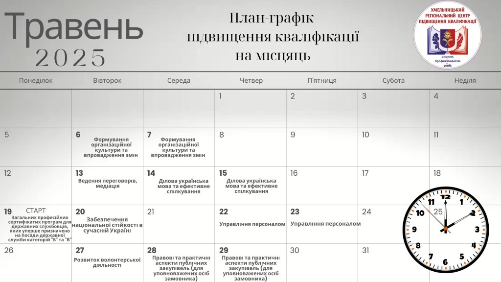 Пропонуємо до Вашої уваги план-графік підвищення кваліфікації у Хмельницькому РЦПК в травні 2025 року за програмами: